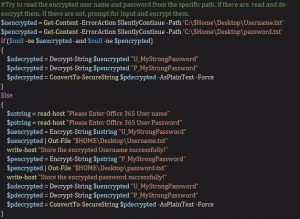 - Office 365 PowerShell?會(huì)顯示無法通過 Microsoft 365?管理中心看到的其他信息;在連接過程中,如果用戶名和密碼以明文形式輸入,就會(huì)帶來安全風(fēng)險(xiǎn)。如果采用以下 PowerShell 腳本就可以避免這個(gè)缺點(diǎn):預(yù)先定義兩個(gè)函數(shù),分別用于加密和解密字符串;然后檢查本地是否存在已經(jīng)加密的用戶名和密碼文件。如果沒有,提示用戶輸入用戶名和密碼,并將其以密文形式存到本地;最后,讀取本地加密的用戶名和密碼,并將其解密,用于遠(yuǎn)程連接 Office?365?Online。腳本代碼分為以下三個(gè)部分介紹給大家: