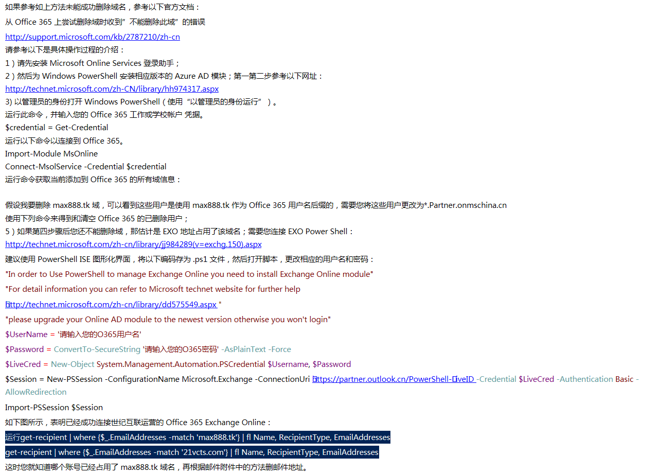 5)如果第四步驟后您還不能刪除域,那估計(jì)是 EXO 地址占用了該域名;需要您連接 EXO Power Shell:
